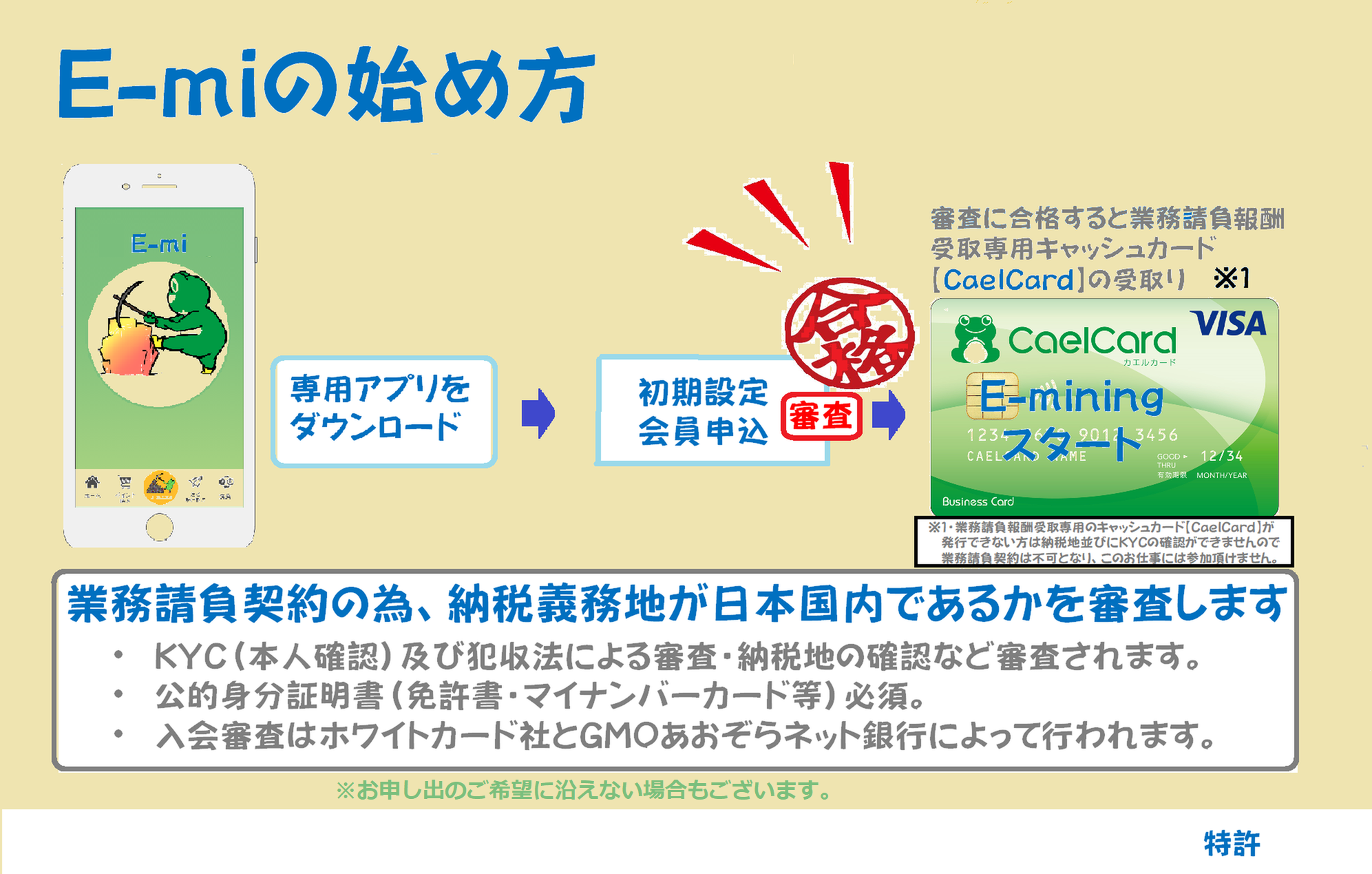 お申込みお問い合わせ(以下の情報は)入会審査時に専用キャッシュカード「CaelCard」を発行するに当たって、発行が可能であるか「納税義務地が日本であるかどうか」などを確認の為、業務委託先の資金移動業者(ホワイトカード株式会社)並びに資金移動業者が提携する金融機関(GMOあおぞらネット銀行)によって公的身分証明書と照合致します。